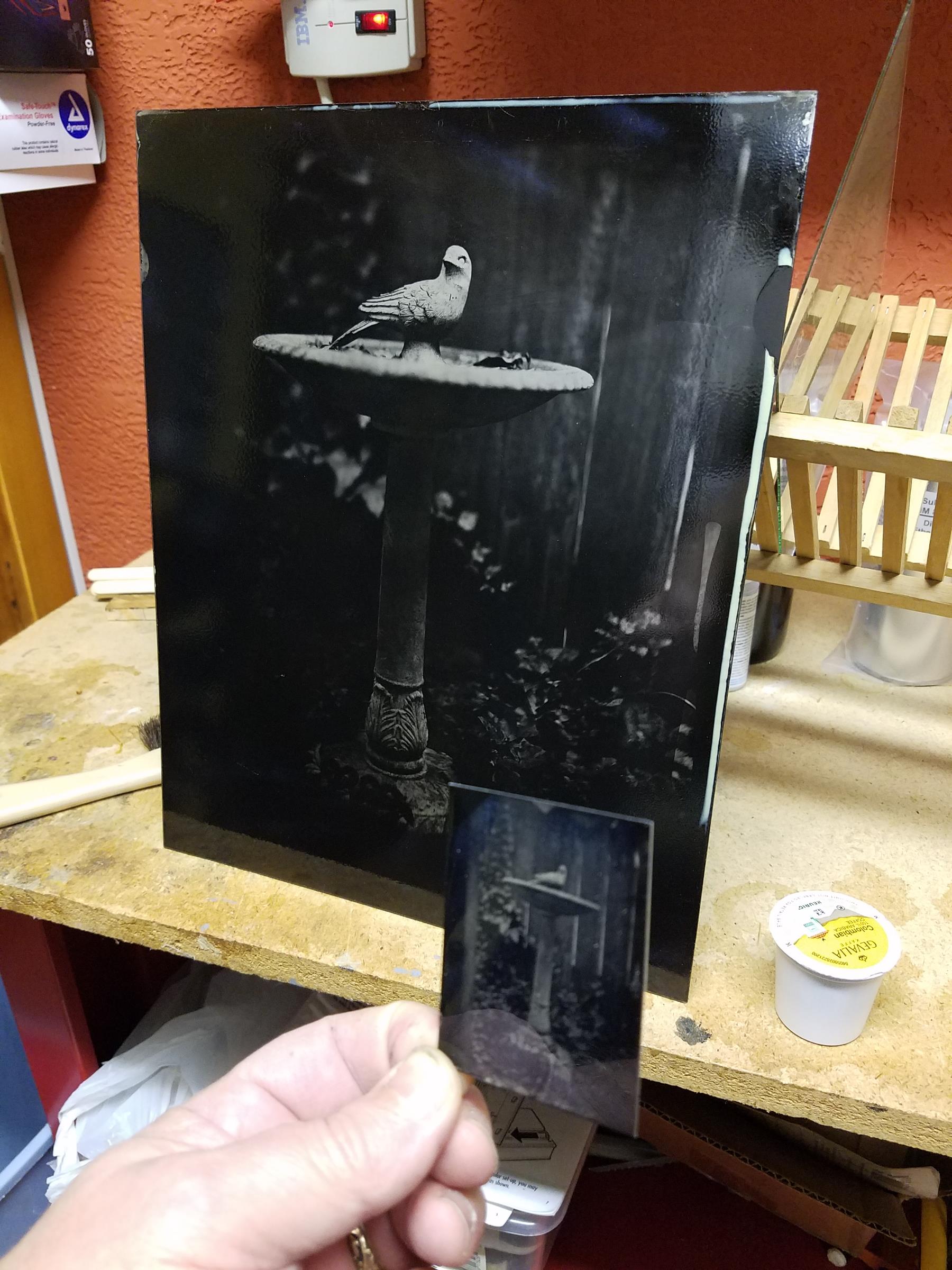 Earlier this week, as I gazed on the flimsy plastic frames I had liberated this plate glass from, I realized that I could stack two frames (secured firmly together by 3 #4 brass screws per side) as the cassette and use the gap in between as the guide for a dark slide. I used a table saw to dado a wide cut across the end of one frame for inserting the dark slide. Likewise, I could stack another two, and I had my ground glass adapter. The backing cardboard could be used as the dark slide since it was already cut to fit. A pair of the hanging hooks doubled as spring clips to keep the contraption in place. And Dollar Tree sells kitchen cutting mats, 2 for $1, that are 11x14" with a matte surface that drops right into the focusing frame like it was made for it. Today I got to try out this cheapo hack, and it did its job like a champ. My first effort was slightly underexposed, but it proved the concept of using an extension back to get new use out of a smaller view camera. This was also my first large format pour, harrowing to step up to but exactly like using the smaller sizes in practice.