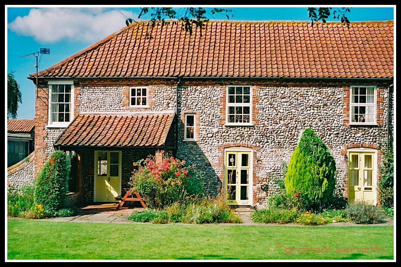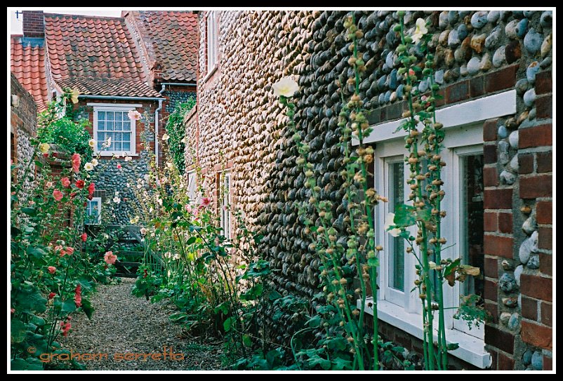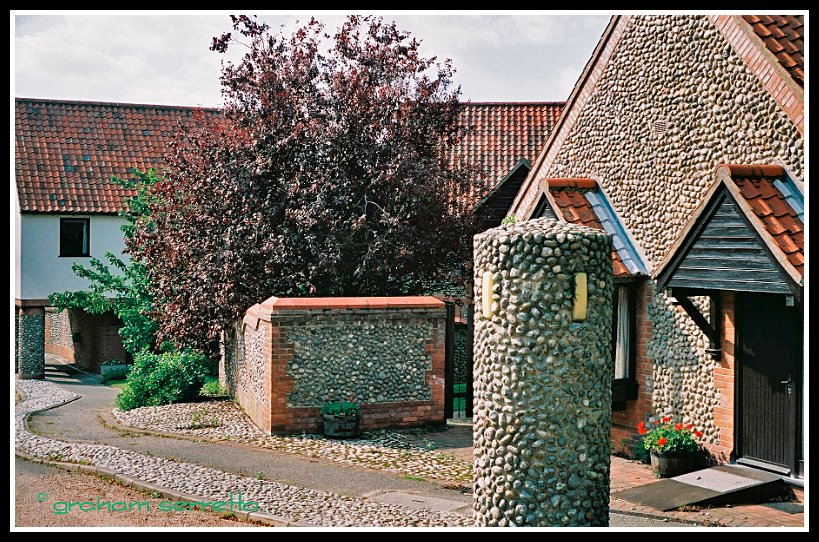 While we were visiting my daughter in Kings Lynn, Norfolk, recently, we took a drive up the Norfolk coast to a village called Blakeney, in the Fenns. The most unique thing about the area is the beautiful and striking stone construction used to build the local houses. There are a number of different styles of stone work, some using the red, flat stone of the fens, others using the more rounded flintstone of the shore. The decorative effect is quite striking and unusual. The fens are subject to a large tidal rise and fall, and few roads reach the shore - the rivers become mud channels at low tide, yet in times past, there was a large fishing industry here.