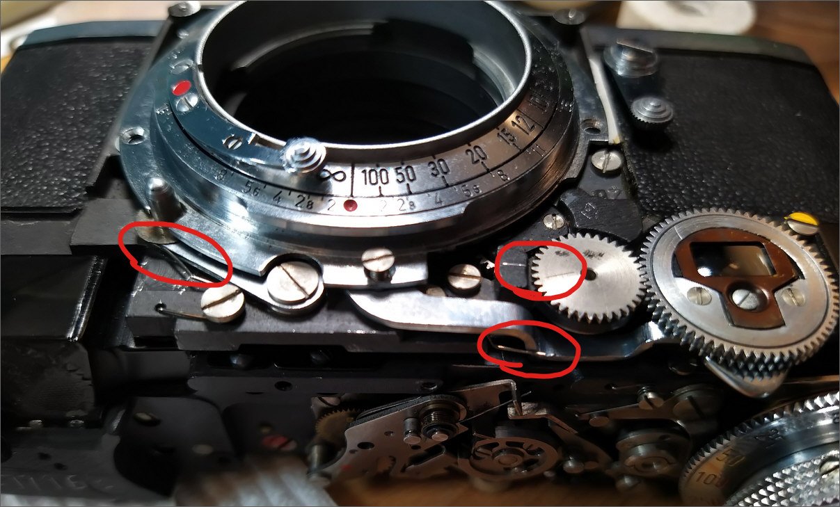 Just got the helical lock reassembled. The trick is to first put the finger lock into place and then loosely place the swinging wedge prism into place with just the yellow screw loosely in place. Then slide the lens lock and helical into the body. A bit of wiggle here and there, and it's good to go. You'll notice the horizontal scratch marks on the geared wheel and the piece next to it. This was to indicate rangefinder calibration. Because that assembly had been tightened into place, I pulled away from the helical and rotated until the two marks aligned. I'll confirm later and make any micro adjustments, if needed.