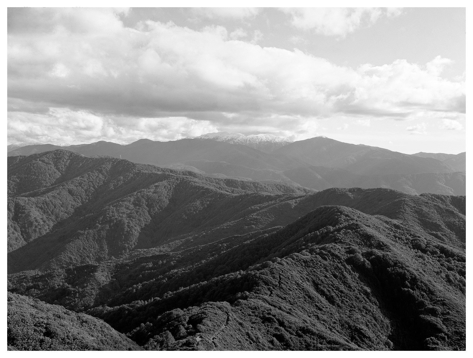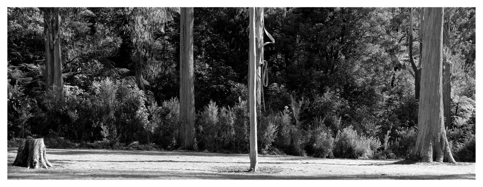 I headed north from the city towards the Remutaka range to have a wander round the various forest parks and hills to see what I could find. I followed a track up to a waterfall and lookout, but while very pleasant, they weren't photo-worthy. But the flat area at the start of the walking track was looking more like it, with the light striking across the non-native gum trees. I had in mind a panoramic framing, approximating the XPan format. So, I pulled a DDS with some Efke 25 from the bag and setup the camera. This time, the bright focussing screen and magnifier made life much easier. I was quite pleased with the result: