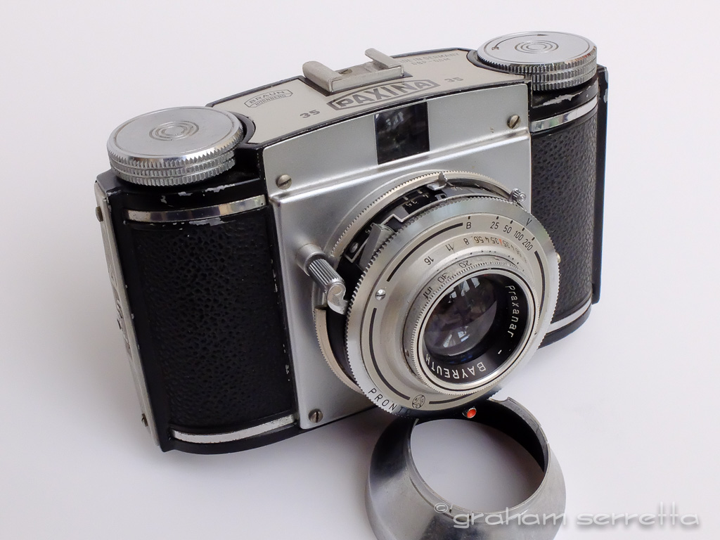 This is a Braun Paxina 35. Manufactured by Braun Kamerawerke in Nuremburg between 1953 and 1954. It had a sister model 29 fitted with a f2.9 Praxar lens. Despite the moniker, (which alludes to it's f3.5 lens) it's a 120 roll-film camera taking twelve 6X6 negatives. The lens is a 75mm f3.5 Praxanar mounted in a Pronto shutter with speeds of B, 1/25, 1/50, 1/100 & 1/200. The lens assembly is mounted on a retractible tube which has to be extended to take photographs, and collapsed for storage. There is no double exposure prevention and the film frames are counted using the traditional red window method. The eye-level viewfinder is rudimentary and the view is obscured by the upper part of the lens assembly. Focussing is by rotation of the front lens element. If you kept your wits about you, you could obtain good results as the lens and shutter are superb. There is an accessory push-on lens hood, which I have used as a rest to support the camera for the photos. The top photo shows the lens retracted and the lower picture shows the lens tube extended for use. When retracted, the shutter release protrudes into a socket on the camera body preventing actuation.
