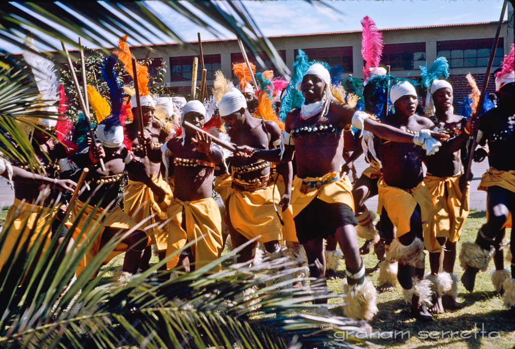 Going through my collection of slides, I came across these two shots taken with an Exakta Varex IIA on Kodachrome II, at what is commonly called a "mine dance" in RSA, in the 1960's. The mine workers were mostly migrant labourers who lived in accomodation segregated according to tribe. On Sundays, the various tribes put on a display of tribal dancing in a purpose built arena. If I remember correctly, the first shot is of the Shangaan, or Tsonga as they are also known, who come from Mocambique. Their performance consists of a series of solo displays, each demonstrating how fierce and virile the dancer, or warrior, is. The second group are Xhosa who have "modernised" their tribal dress with coloured ostrich feathers instead of the original white ones.