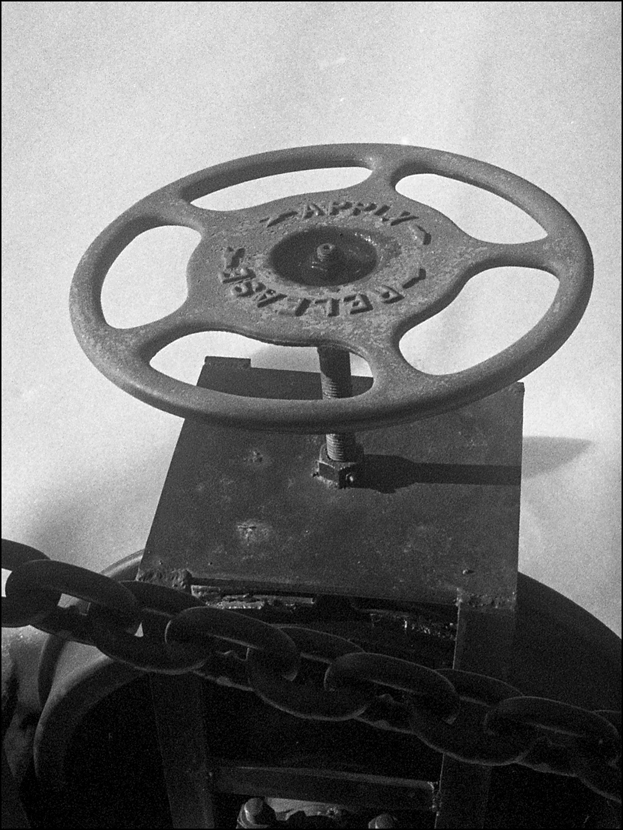 This wheel is part of a big set-up between two shop buildings. I don't know how it works but I like its simple design