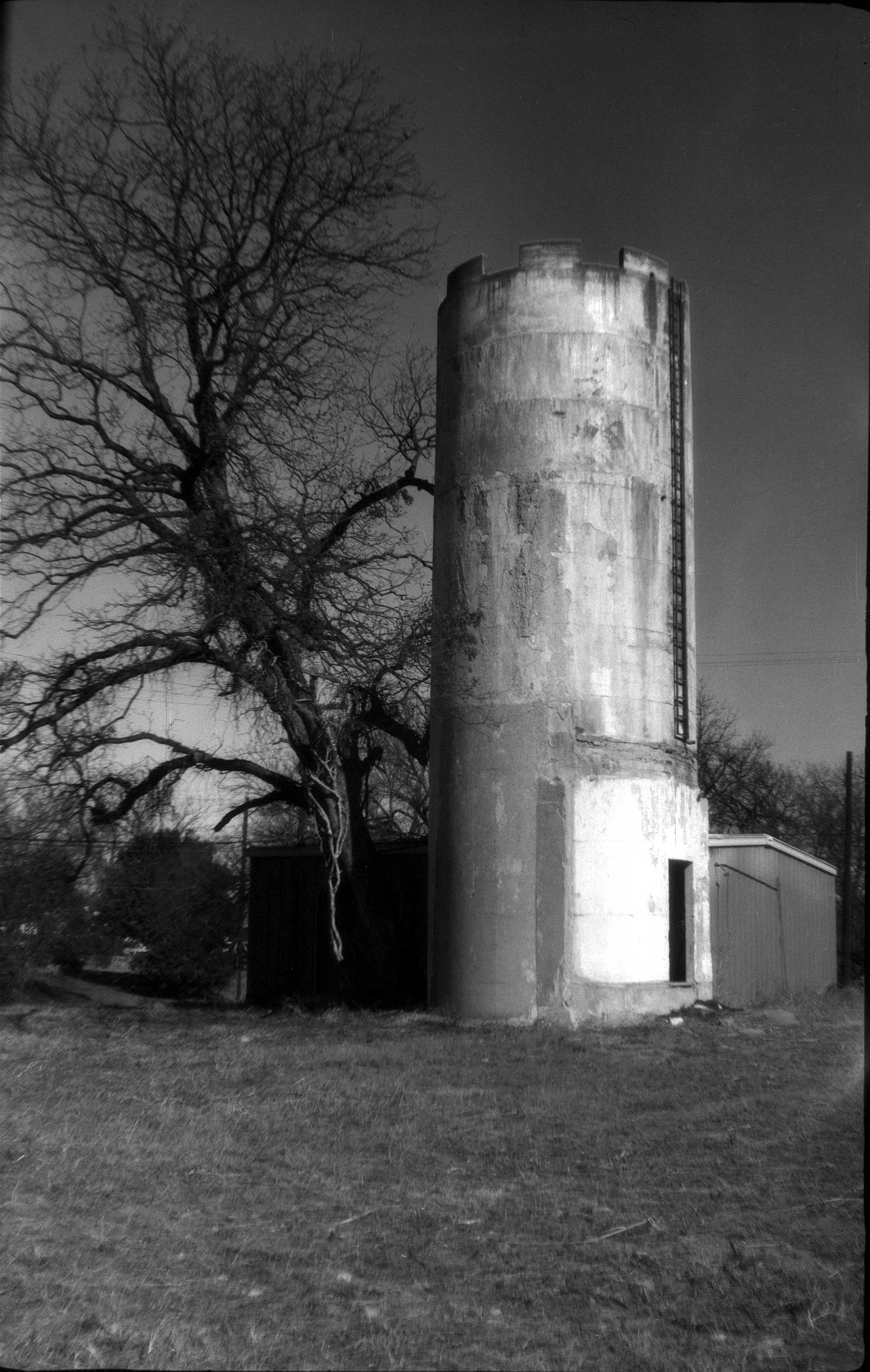 The next day I prepared a test roll of Aero Plus-X film trimmed down to 127 width. I chose an old water tower in Mason to check out the various apertures (circle dial style with 1-2-3-4 settings) using Aero Plus-X film cut to 127 size. This film has nice mid-tone coloration. The swirly edge detail in the result scan is de regueur for the simple meniscus lens, even at the #1 aperture setting (roughly f/22 by guesstimate). Scanned at 1200 dpi on Epson 4990.