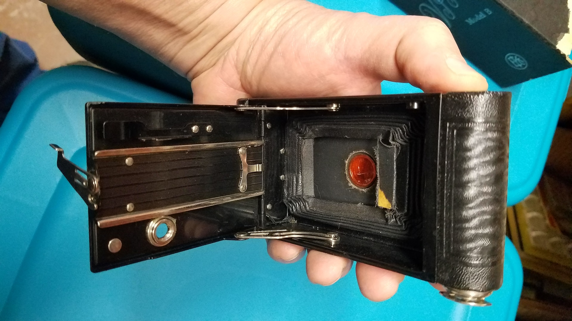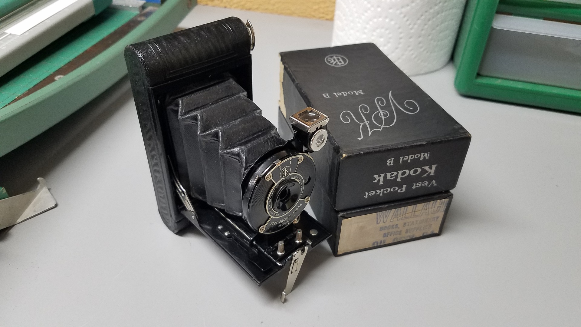 For my first camera restoration of 2018, I chose a Vest Pocket Kodak Model B that I found on eBay. The set included the near-mint camera, its manual, and a fairly complete original box. Although nearly new in most respects, the camera had a completely hardened bellows that had already separated from the front standard. This had to be rectified either to shoot with or ever sensibly display the camera.