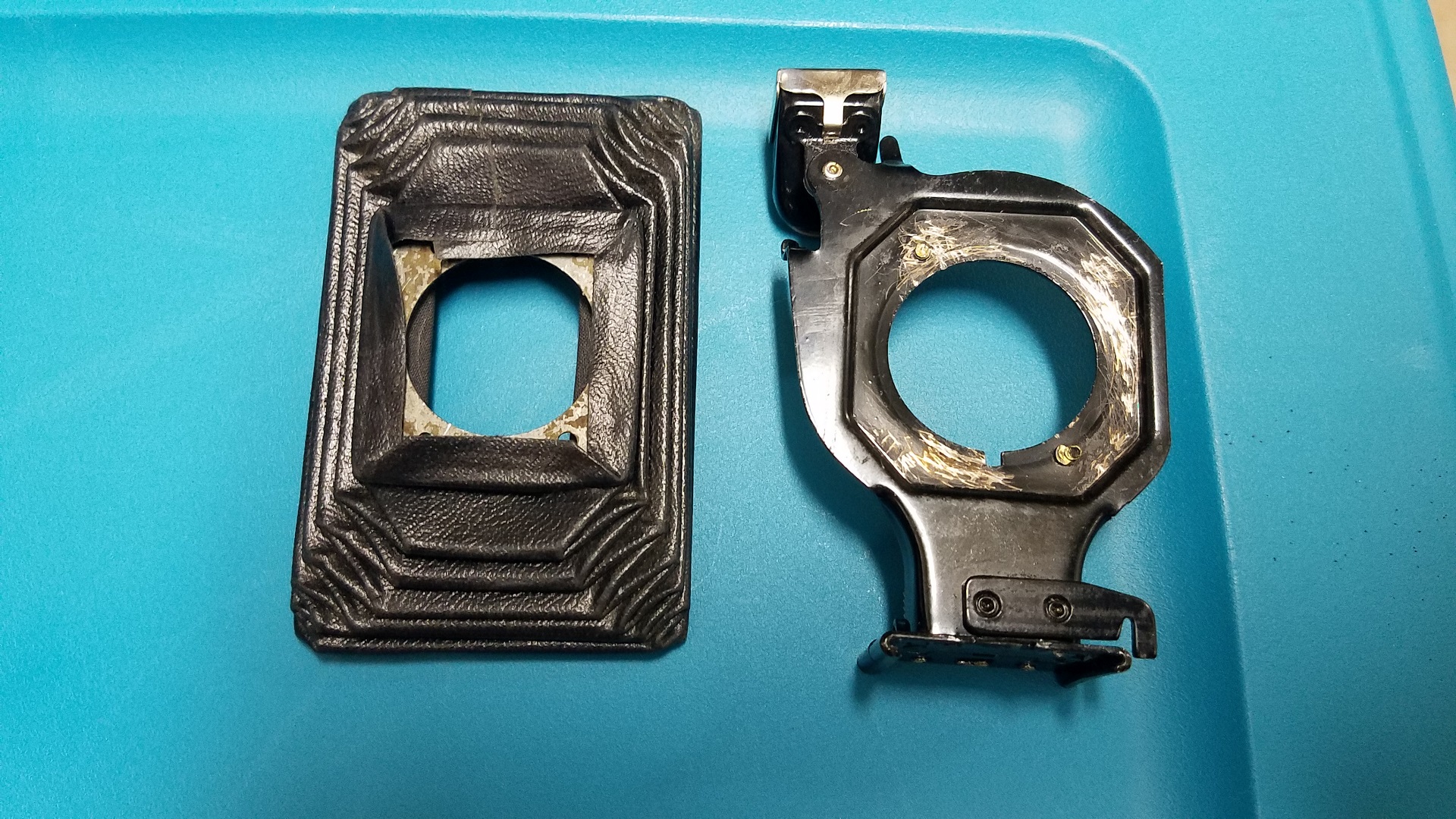 I found a similar new-old-stock bellows from another eBay seller. The front ring was different, so I pried off the front flaps of the NOS ring and glued in the original front ring. With my screwdriver-turned-tab-lifter tool, I replaced the crappy bellows with this modified as-new bellows.