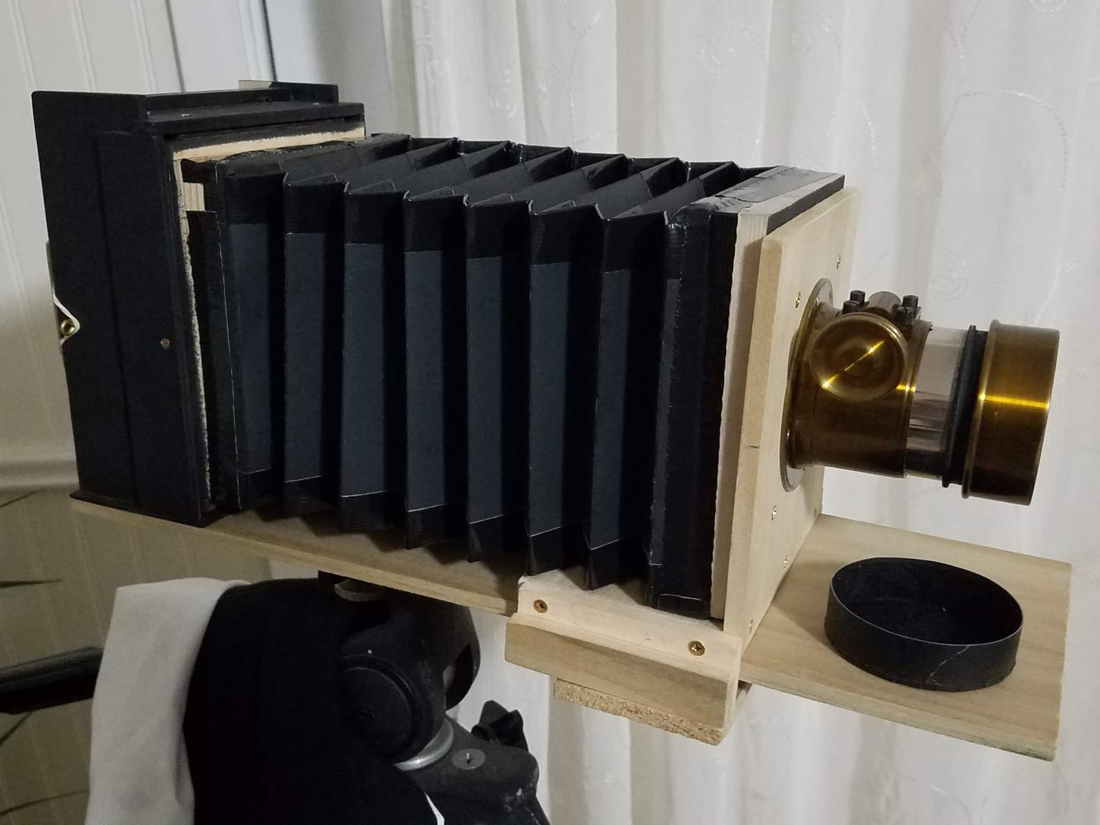 BTW, here is the homemade camera I have ended up with after several test bodies. The lens is a 9" f/4 Petzval that could cover whole plate if I accept the considerable bokeh (who wouldn't?).