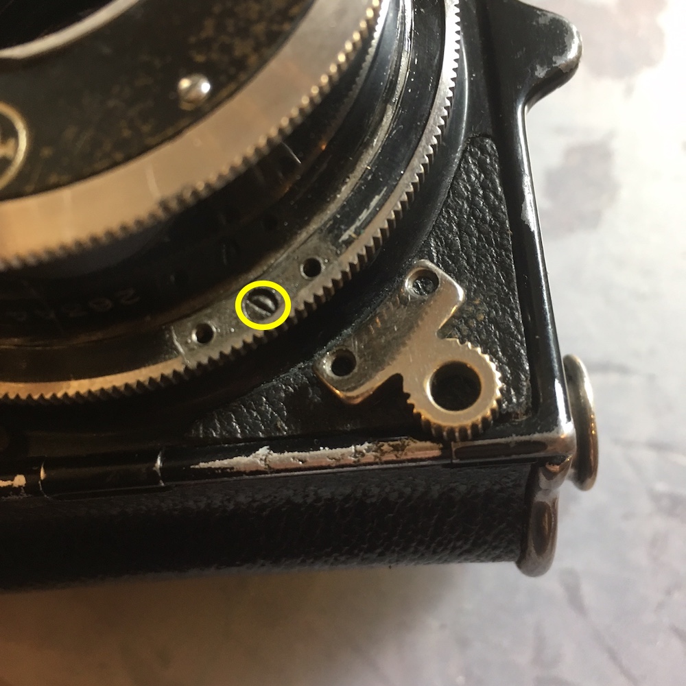 Wait! There is an helicoid and the focus is done by group, not only front lens. So I remembered how to take out the shutter from the helicoid with the Pearl III, it should be an screw somewhere, and here it was, below the focusing handle. This screw has two meanings, firstly not allowing to take out the shutter completely from the helicoid, this is minimum focus distance and to the other side another stop that is infinite and resting position.
