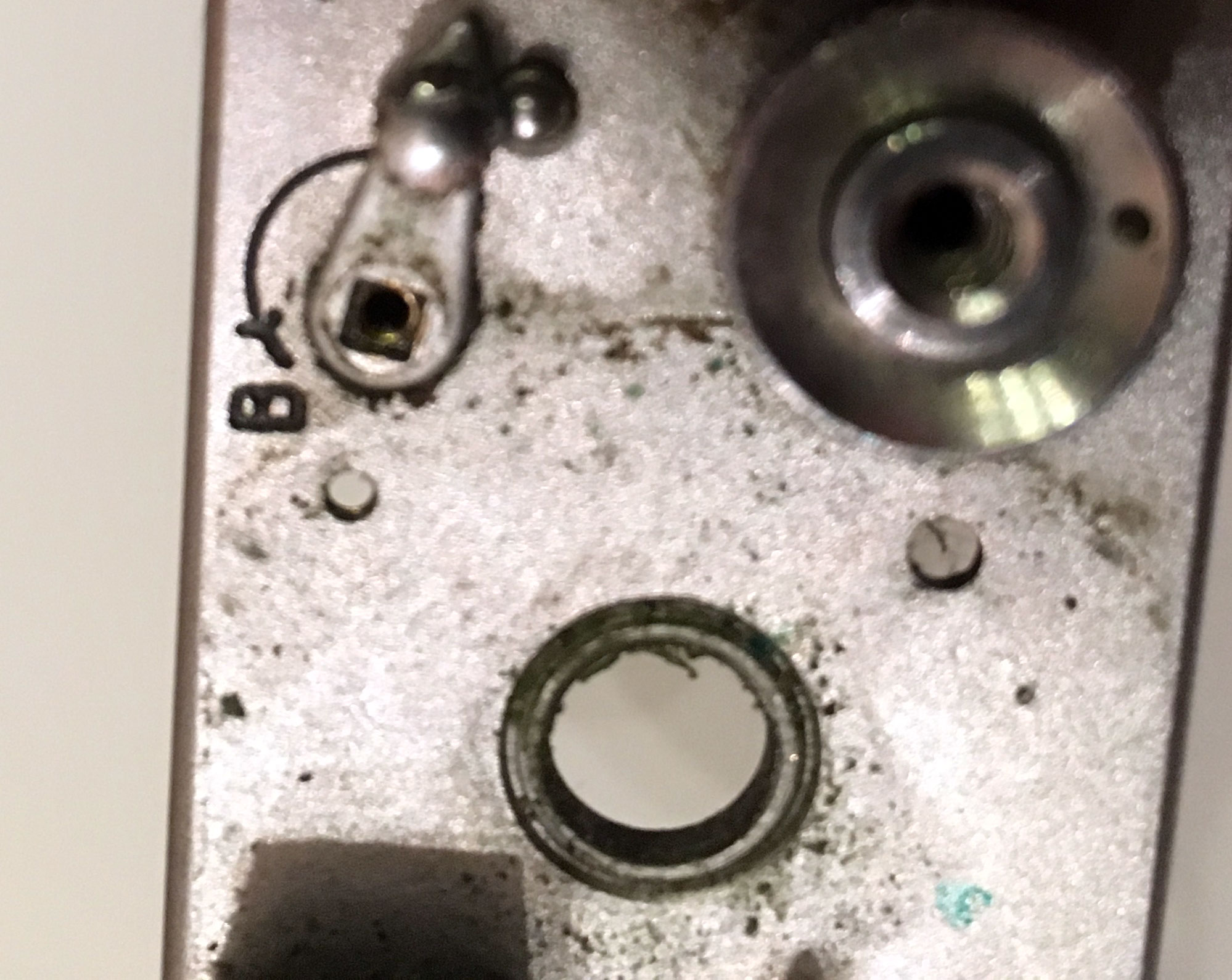 The spring with the two holes for the screws, notice the the spring came out from its natural position.