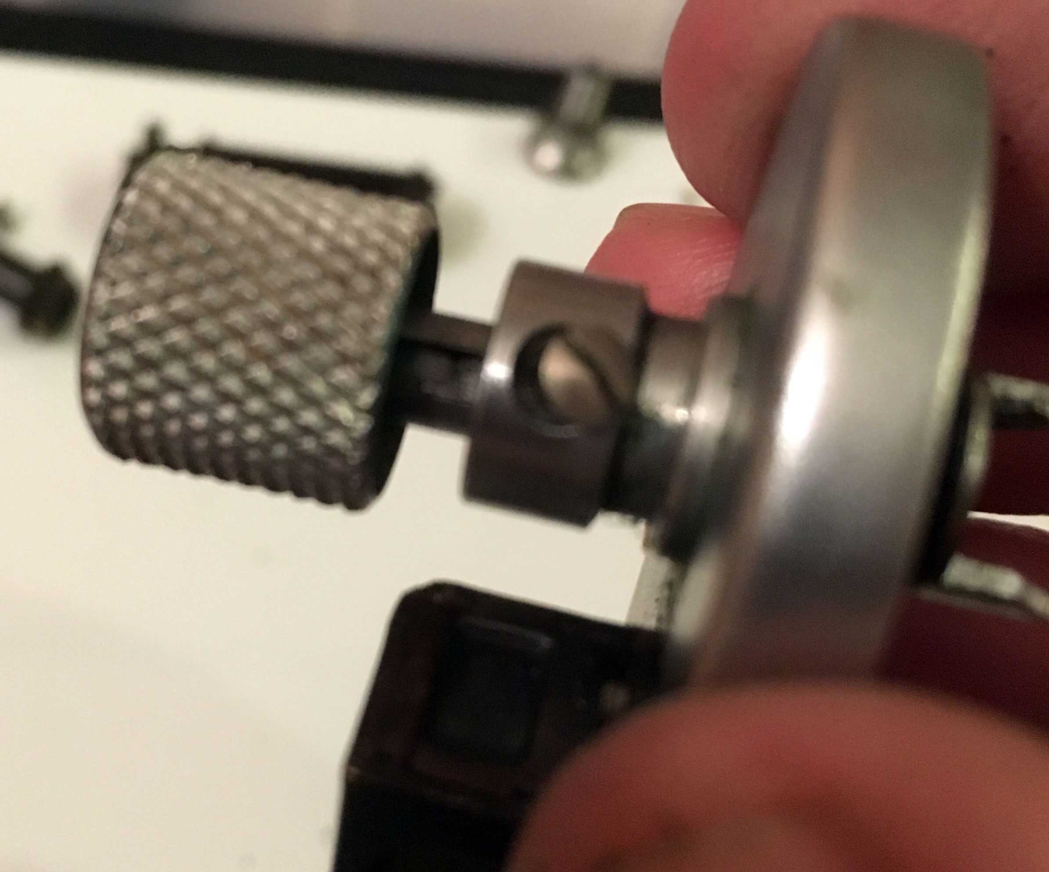 Now we remove the shutter release button with the film guide roll, first unscrew this little one