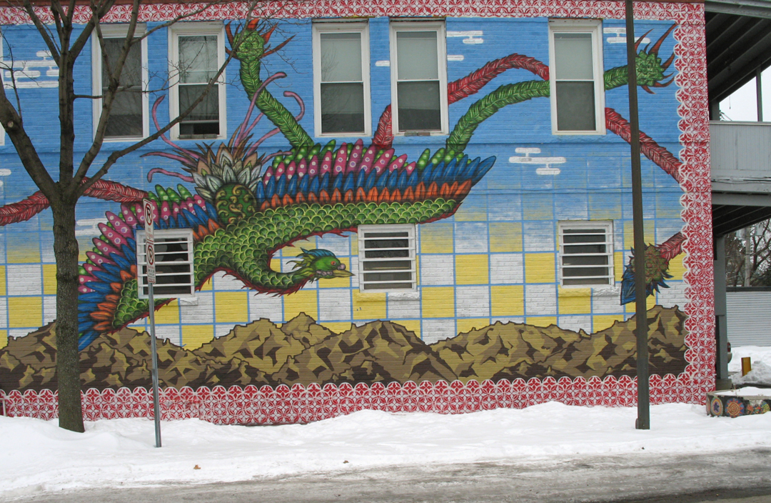 Dragon Bird on Mural at Snelling and Thomas. The whole side of the building is shown in the last photo (Canon PowerShotA620).