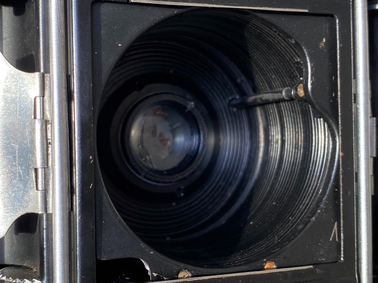The RF mechanism consists of the Super Ikonta B style prism (but here uses a slightly different optical method) coupled with RF windows that are separate from the (very basic) viewfinder. The "half-silvered" mirror is held in a small metal holder that is screwed to the bakelite upper frame. There are three screws on the right side (small top and bottom grub screws, a larger screw in the middle), one difficult-to-access screw on the left. The two grub screws are to adjust the vertical alignment. A combination of adjusting these and the larger locating screw on the right appears to control the horizontal alignment. I removed the mirror housing to find a "munted" (kiwi slang!) half-silvered mirror. Fortunately I have a couple of pieces of replacement mirror that I got some time ago off Edmunds. A quick measure, mark, glass cutter and snap and I have a replacement. I played around a bit to better understand the adjustments before using a couple of spots of clear modelling paint to secure the mirror in its little housing. I then spent a half hour or so of trial and error getting first the horizontal alignment at infinity, then adjusting the little grub screws to sort the vertical alignment.